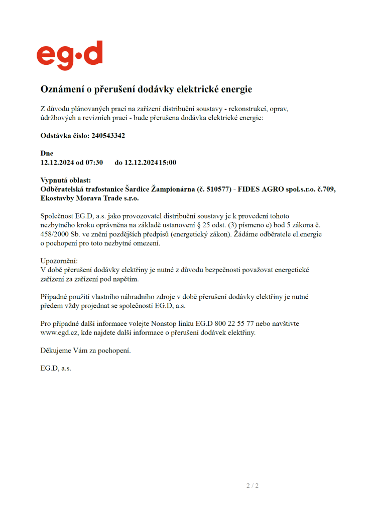 Oznámení o přerušení dodávky elektrické energie dne 12. 12. 2024 od 7:30 do 15:00 hodin.