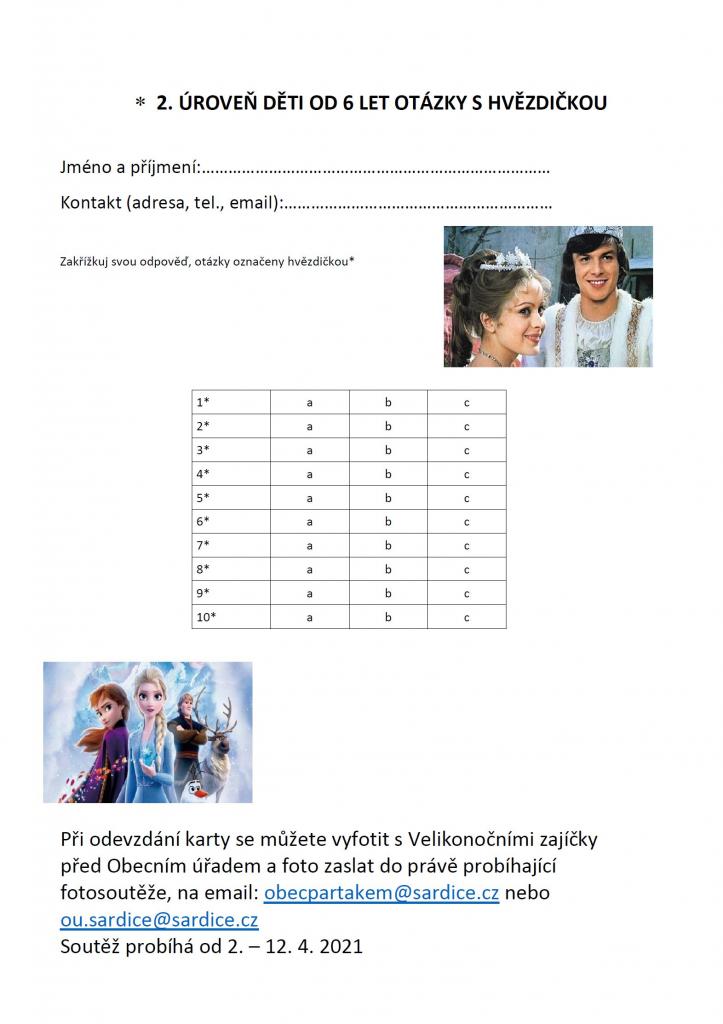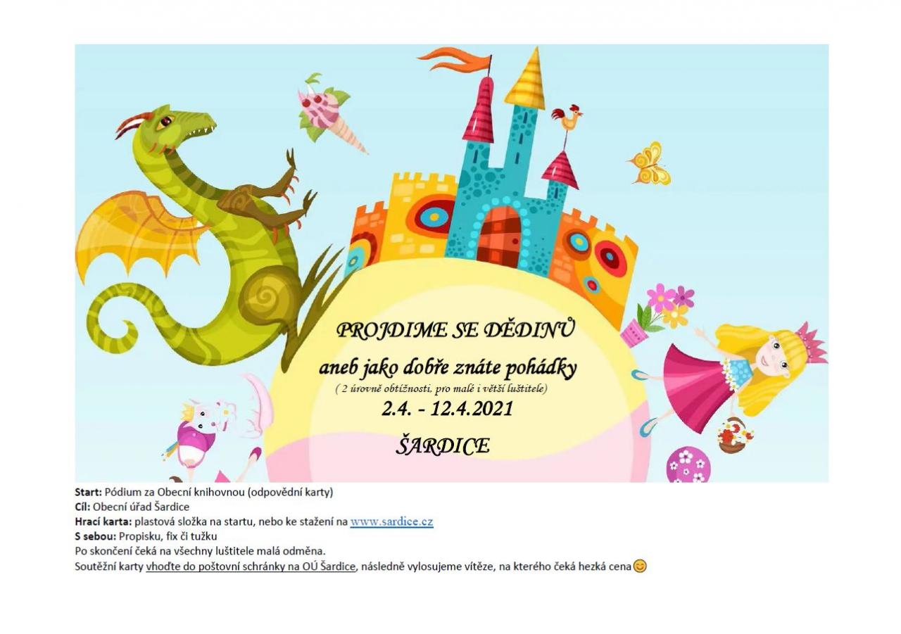 Vážení občané, zaměstnanci Obecního úřadu pro vás připravili pohádkovou trasu, Projdime se dědinů, aneb jak dobře znáte pohádky. Start je za Obecní knihovnou, kde si vyzvednete hrací kartu s mapkou. Trasa vede k mostu u bývalé Domovinky, přes hlavní silnice směr hřbitov, dolů k parčíku u hřiště, petangue hřiště, po cyklostezce k ovečkám a zpět k Obecnímu úřadu, kde prosím vhoďte hrací karty do poštovní schránky.