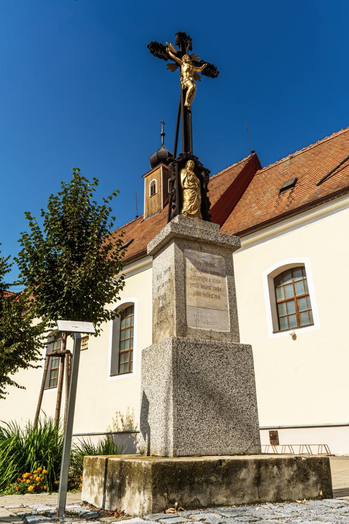 Kříž byl dříve v samé blizkosti přední části kostela. Na přední straně „Ó Vy všichni, kteří jdete mimo, pozorujste a vizte, jestli bolesť Vaše, jako bolesť moje“. Na boční straně je nápis: „Kříž tento opr. na památku Marty Jurákové, nar. II./10 1918 zem. 22/8–1930“ Z druhého boku nápis: „Blata a Fronek Šardice“