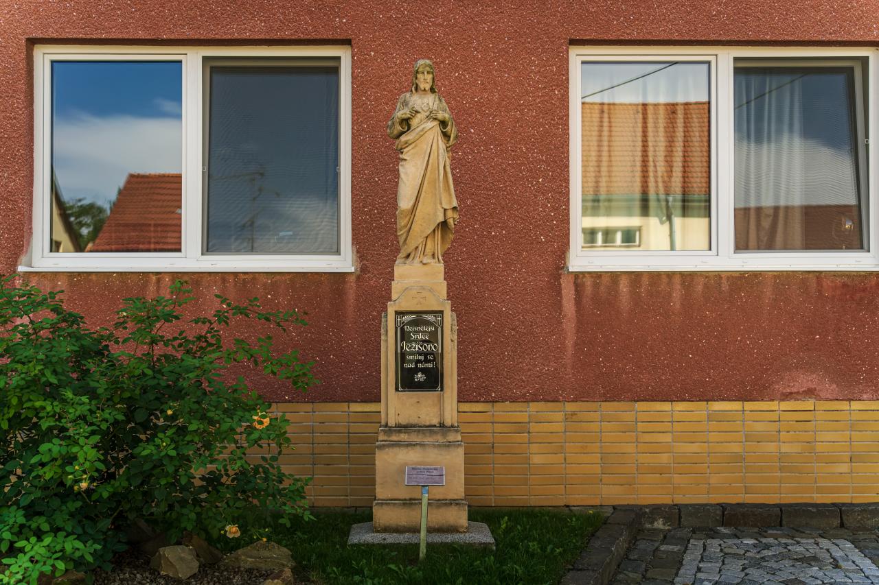 před domem č. 338. Dali postavit Michal a Františka Blatovi.