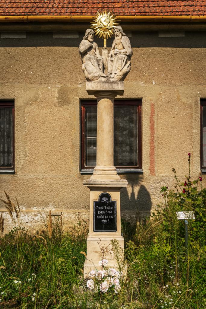 před domem č. 243. Nápis „Svatá Trojice jeden Bože, smiluj se nad námi“. V zadní části sochy je napsáno „Nákladem Jana Novotného – 1920“.